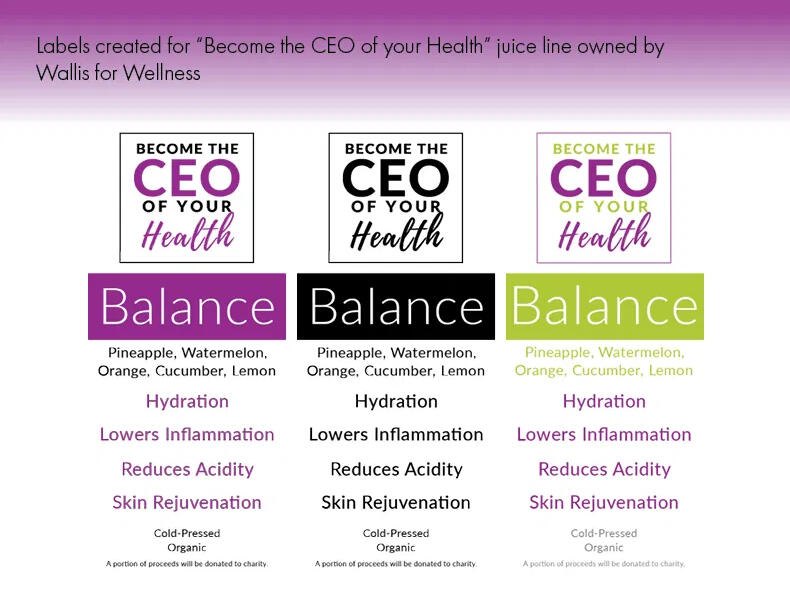 Commissioned to create juice labels for Wallis for Wellness (and Balanced Bodies) to kick off their new, health-conscious juice line.